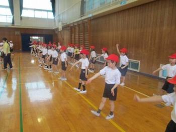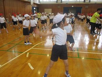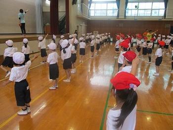 運動会の練習では、1年生と2年生が合同でエイサーの練習です。