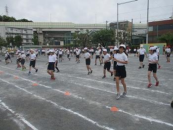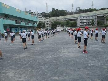 5・6年生が初めて校庭に出て、並ぶ位置を確認し…