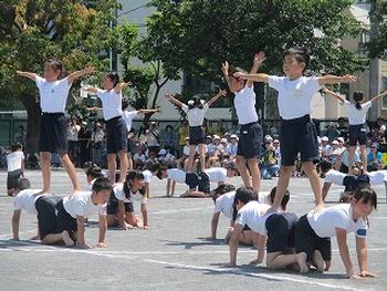 芸術的な、中学年団体演技「まぁスカッと!挑戦」。