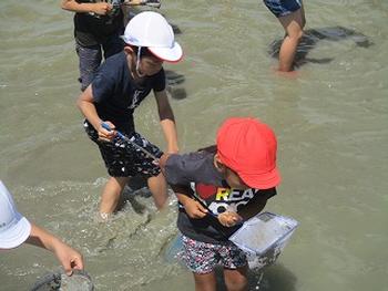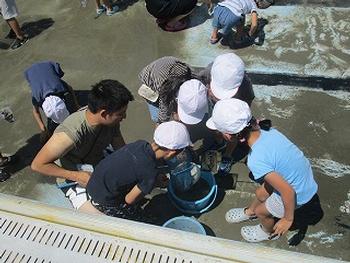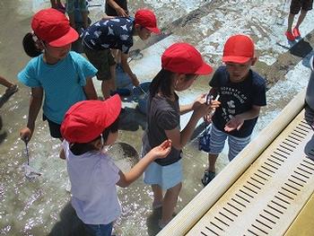 プールを清掃する前に、2年生がヤゴ捕りをしました