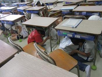 今年度初の地震を想定した避難訓練。机の下で頭を守って…