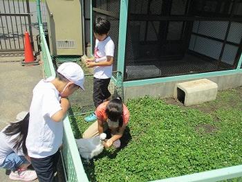 飼育小屋では、動物の飼育委員が動物の世話をしています。
