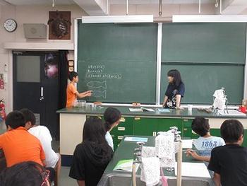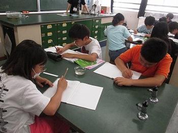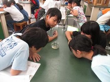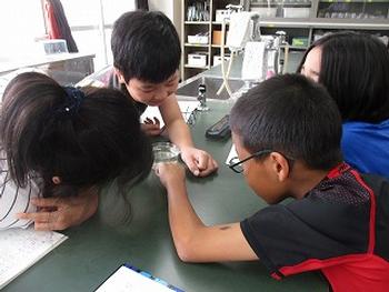 学校の池にいたメダカを観察して、違いを見つけていました。