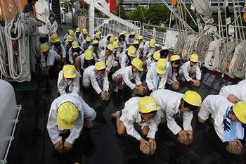 朝食の前に、甲板磨きは椰子の実を使って…「ワッショイ!」
