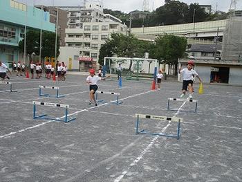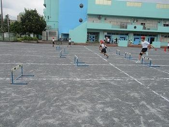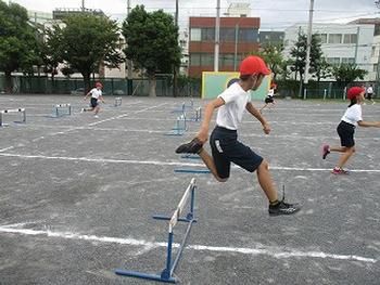 学校に戻ると、4年生がハードル走の練習をしていました。