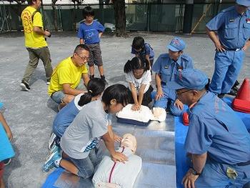 ダミー人形を使っての心臓マッサージ。