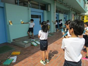 1つの的に、3人で鏡を使って反射させた日光を集めます。