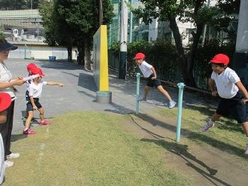 慣れの運動をしています。「ツバメさんがとまったよ。ピタッ!!」