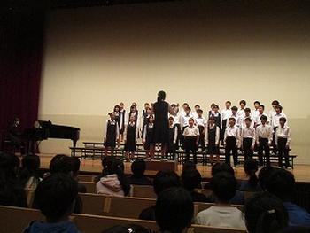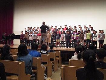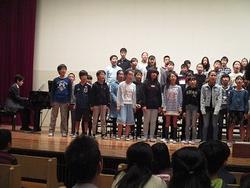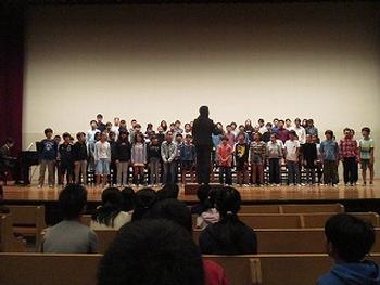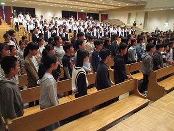 Y校の講堂で、蒔田中と蒔田小と一緒に合唱交流をしました。