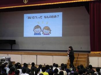 朝会では、教務主任の先生が挨拶についてお話しました。