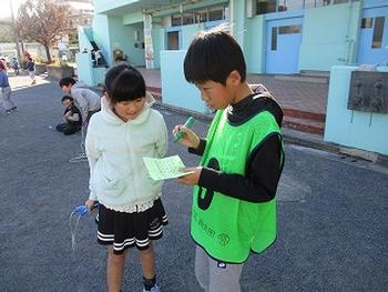 ゼッケンを着けた運動委員から、カードにチェックをもらいます。