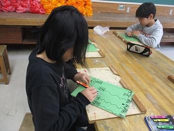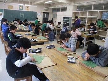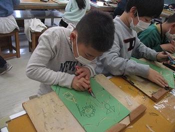 初めて使う彫刻刀で、木版画の制作をしていました。