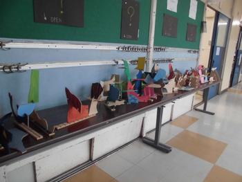 糸のこぎりで作った作品が教室前に飾られています。