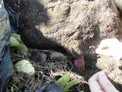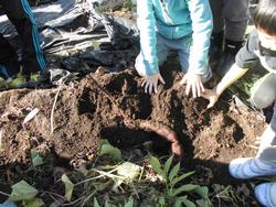 蔓を抜いて、地面を掘ったら、、、「あっ見えた!」