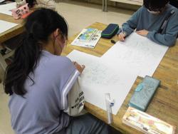 へんてこな形をいかして「へんてこ学校」を考えて描いています。