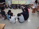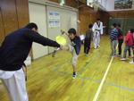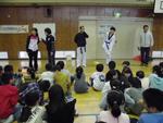 毎年この時期に在籍児童のつながる国の遊びやスポーツなどに親しむ集会を実施しています。今年は韓国の蹴鞠(けまり)とテコンドーを体験しました。講師には韓国語教室の先生と炫武館道場のマスターに来ていただき、2日間にわたり多くの子どもたちが参加しました。 テコンドーの演武は迫力満点でした。