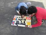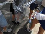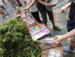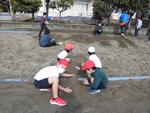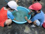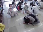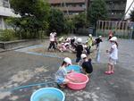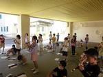 1年生が生活科で水を使った季節の遊びを楽しんでいます。ペットボトルやケチャップなどの空き容器に水を満タンに詰めて砂場に流したり、遠くに飛ばしたりして大喜びです。隣では2年生が図工で作ったペットボトルアートに水を入れて楽しんでいます。この季節、水を使った活動は大人気です。