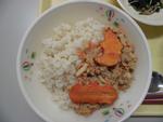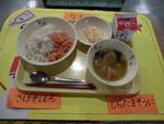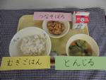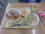 今日から給食が始まりました。1年生は初めての給食です。白衣の着方や机上の整え方などを確認してから廊下に並んでワゴンのあるホールに受け取りにいきます。地域サポーターさんの支援を受けながら配膳完了。「マスクを取ったらお話はしません」の約束を守って静かに「いただきます」をします。今日の献立はツナそぼろ、豚汁、麦ご飯、牛乳です。残さずに食べたかな?藤給食センターのみなさん今年度もよろしくお願いします。