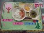 ひな祭りにちなんで今日の給食は鮭そぼろと卵そぼろの「菜の花ずし」でした。見た目も鮮やかで季節感のある献立です。