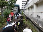 3年生が体育館裏手の花壇を整備して花いっぱいプロジェクトを始めます。体育館の裏手は普段子どもたちが行くことのない場所ですが、駅から区役所に至るメインルートに面しており多くの市民の方が通る「学校の顔」といってもよい場所です。3年生がこの場所を手入れして、「道行く人たちに笑顔になってもらいたい」という思いで始めたのがこのプロジェクトです。今後の活動が楽しみです。