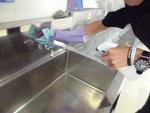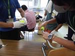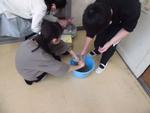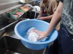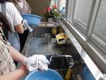家庭科で6年生が洗濯に挑戦しました。といっても洗濯機ではなくたらいに水を張り手洗いで汚れの落ち具合を確かめながらゴシゴシしていきます。昔ながらの方法ですが、実際に汚れが落ちてくると自然と力が入ってきます。暑い季節なので水仕事は気持ちがよいようです。