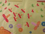 世界の言葉で「こんにちは」が書かれています。その国のフルーツや食べ物なども色鮮やかに描かれています。地域の方に制材していただきました。ありがとうございました。