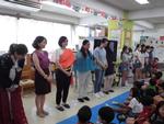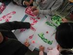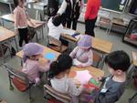 次は、各教室にてペアや3人組での交流です。メダルのプレゼント、朝の支度の練習、鉛筆を使って線なぞりなど・・・寄り添って優しく教える「ミニ先生」の1年生、頼もしいです。