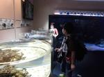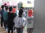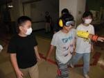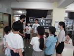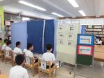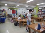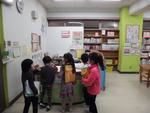 理科室で実験をのぞいたり図書室のカウンターに集まったり校長室の写真に興味を示したり探検隊は大忙し。
