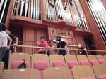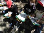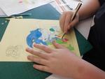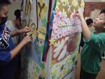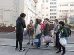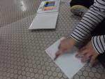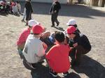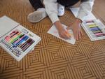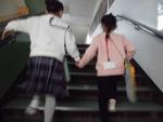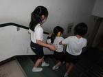 手をつないで仲良く行こうね!階段の踊り場で絵を描く5年生に話しかけます。