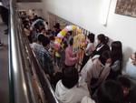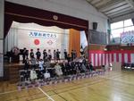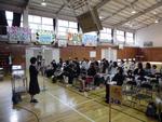 教室では6年生がお出迎えです。トイレに誘導したり、手提げをフックにかけたりと大活躍です。そして体育館では2年生がアトラクションのリハーサルを済ませてスタンバイです。開式に先立って校歌を披露し、1年生の生活のことを教えてくれました。1年生は興味津々、目を丸くして聞いていました。