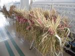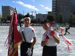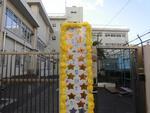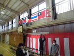 児童の下校後は職員による準備です。紅白幕を張り、国旗や市旗を掲げ、届いた花をセッティングします。