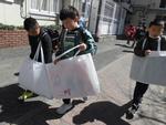 教室では担任に続いて一人一人の自己紹介です。進級して気持ちも新たにスタートを切る子どもたちです。自己紹介の次は教科書配付。家庭科室から4階までたくさんの教科書を手分けして運びます。全ての教科書に名前を書いて中身を眺めて「え~、こんなにいっぱい勉強するの?」