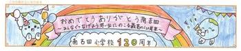 今朝の児童朝会では図書委員会から読書の表彰と120周年実行委員会からスローガン発表がありました。各学年で年間で1番図書館から本を借りた人の名前が発表されて、賞状が渡されます。学校No1の人は140冊も借りていました。すごいですね。続いて120周年実行委員会からメンバーの紹介と横断幕にするスローガン発表がありました。「おめでとおう ありがとう 南吉田 ~みんなでつなげよう思い出にのこる最高の120周年~」に決定しました。選ばれた横断幕のデザインはこちらです。とてもよいデザインになりました。この絵をもとにした横断幕が4月に完成します。4月11日の創立記念式には間に合うように準備していきます。