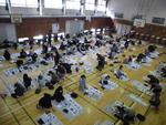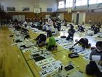 3,4年生が書初めを行いました。体育館に習字道具と半紙を広げて「こうかな」「失敗した」と言いながら楽しそうに書いています。そして書き終えた作品は廊下に展示されていきます。なかなか力強い字が書けています。