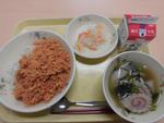 給食はというと、お正月にちなんだ献立です。白玉雑煮、紅白なますに鮭そぼろ。見た目にも鮮やかな給食を子どもたちは大喜びでほおばっていました。