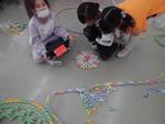 1月にしては温かい1日、青空の下で6組が凧あげを楽しんでいました。それぞれが絵をかいた凧のひもを引っ張り、元気よく校庭を走りながらあげています。風になびいて凧も気持ち良さそう!校庭を走り回るみんなも楽しそう!!
