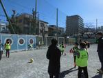 遠くに蹴る遊びと、連続して蹴る遊びブースに分かれて1年生と6年生のペア学年で楽しみました。