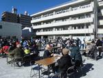 校庭でもちつき大会を行いました。学校開放の登録団体でつくる文化スポーツクラブが主催ですが、各団体だけでなく育友会、おやじたちの会、子ども会、地域協働本部、キッズクラブや青少年指導員や町内会のスタッフの方々も加わり地域総出での開催です。おもち、やきそば、フランクフルトに豚汁、ポップコーンなども販売されて大賑わいです。野球ゲームや、ビンゴ、YYゴールにキッズゲームと子どもたちが喜ぶゲームコーナーもあり、さながら縁日のようです。ゲームコーナーには横浜吉田中学校の生徒がボランティアとして参加していました。