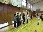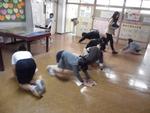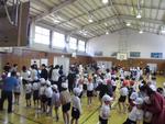 高学年体力アップ集会は陣取り鬼です。紅白に分かれて敵陣深くに攻め込み、大将旗?を奪い合うという鬼ごっこです。体力アップが目的ですが、「捕まるのいやだから!」と言って自分の陣地を出ない子は線を挟んでお互いにらめっこしていました。ここだけ遊びが違ったようです・・・。