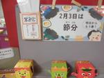 図書館には鬼の本が並んでいます。給食のメニューも節分にちなんであげ大豆、煮魚(イワシ)、豚汁でした。