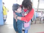 「よっこいしょっと」ランドセルもしょってみます。2年生はハグで先生との再会を喜びます。