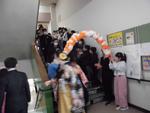 花のアーチで待つ在校生の間を拍手に送られながら、ちょっぴり恥ずかしそうに通っていきます。在校生とハイタッチで分かれる卒業生もいます。
