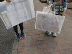 図工や書写の作品が入った大きなバッグを持って下校する子どもたち。