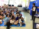 朝会で水泳学習が無事に終わったので、「安全のカギ」が返還されました。夏休みの過ごし方についてのお話を聞く子どもたち。水の事故、交通事故に遭わないように過ごしてください。