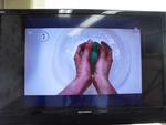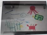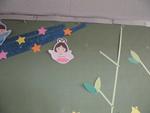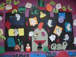 海の中の作品は、「すてき!」と思ってカメラを持って撮影に行ったら、もう片付いていたので画面の撮影で失礼します。壁を海に見立てているところ、剥がれを魚に見立てているところが発想力の豊かなところです。