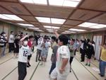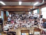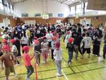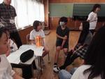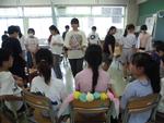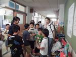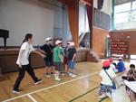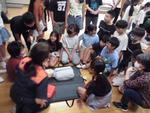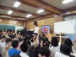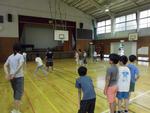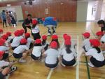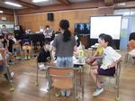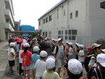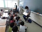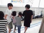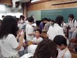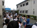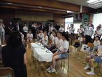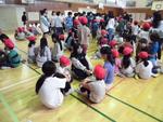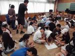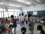体育館で何やら楽しく活動している6年生と1年生。夏休み前に転出する子のお別れ会をペア学年クラスで行っています。4月から4か月間一緒に遊んだり、給食や掃除のサポートをしてもらったりした1年生は、すっかり6年生になついています。暑い体育館で鬼ごっこをして大喜びです。異学年交流は南吉田小学校の特色の一つで、優しさや思いやりの心を育むのに一役買っています。