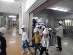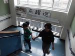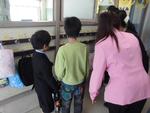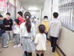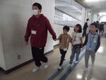 1年生の手を引いて登校班会議の教室まで連れていく6年生。やさしいお兄さん、お姉さんは頼りにされております。