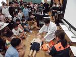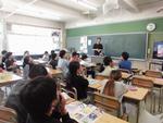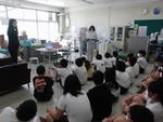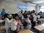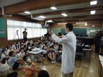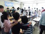 後半は「命の話」です。学校のすぐ近くにある、横浜市大高度救命救急センターのセンター長にお話をうかがいます。「人が倒れている現場に居合わせたらどうする?」という投げかけで始まり、反応がない場合には「大人を呼ぶ」「救急車を呼ぶ」に加えて「心臓マッサージ」をすることを教えていただきました。心臓マッサージや人工呼吸の体験ができる人形やAEDを使って、クラスごとで実際に体験をします。