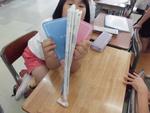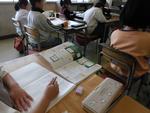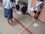 雨の朝で「靴の中まで濡れちゃった」と靴下を見せながら教室に向かう子どもたち。蒸し暑い中汗をかきかき勉強を頑張っています。2年生は算数で長さの学習です。巻尺を持って校舎内のあちこちで長さを測っております。