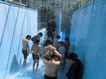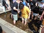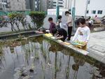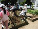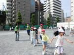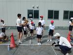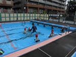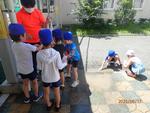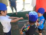 6組の子どもたちは校庭&ピロティで水遊びです。プールに入る練習も兼ねて水着に着替えて本格的な水遊び。こちらもキャーキャー言いながら楽しいひと時を過ごしました。夏は水遊びが一番人気です。
